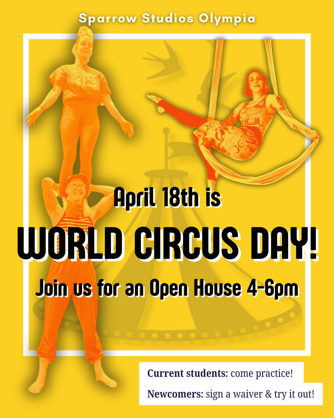 World Circus Day began as a way to generate public awareness for the circus arts. Join us at the studio for an afternoon of circus and community. Bring your friends and family! If you’re a current student you’re welcome to practice or showcase your skills for your family/friends. If you’re a newcomer, you can request a small lesson in one of our dicsiplines to get a taste for what we have to offer in classes.