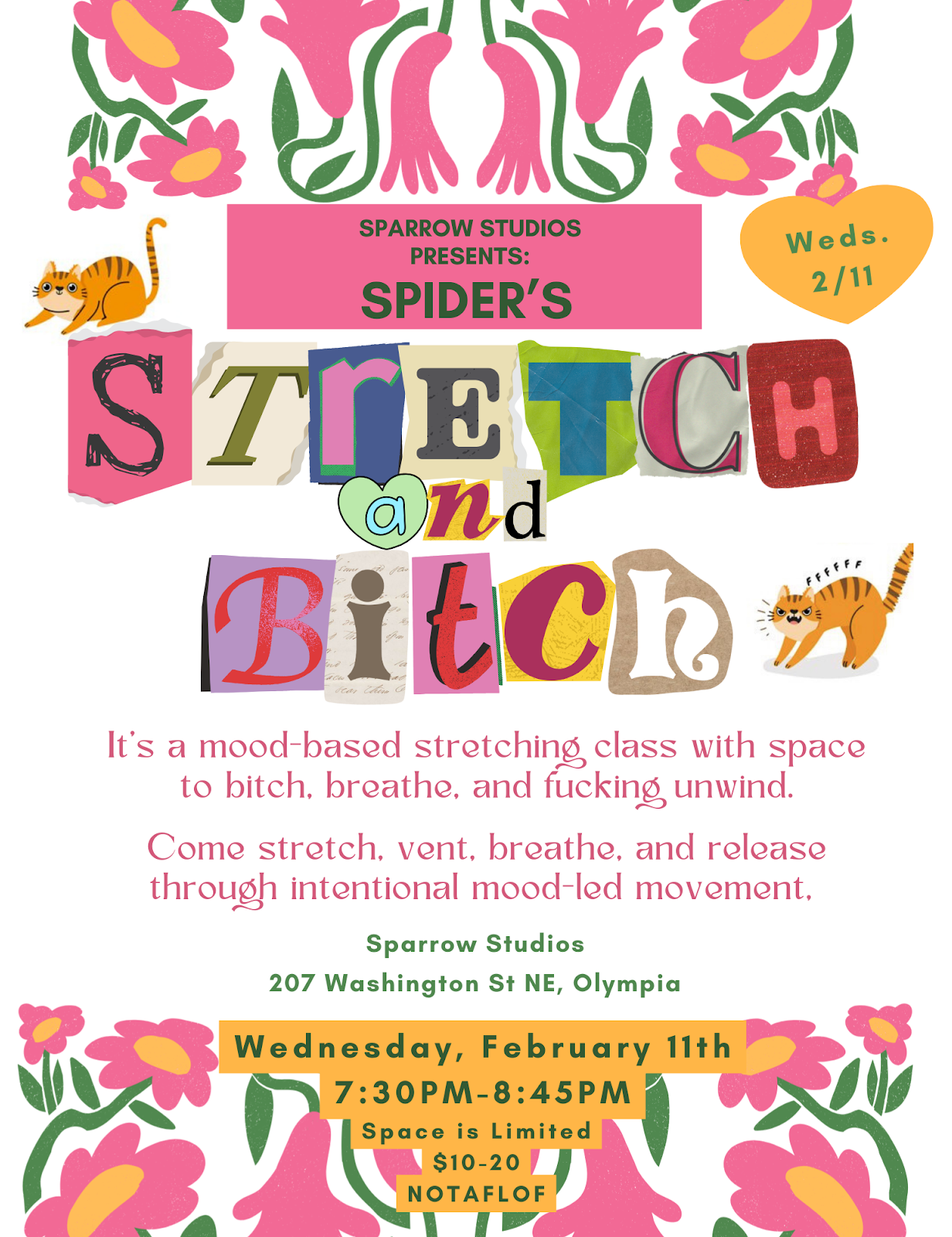 Stretch and Bitch is a low-pressure, somatic inspired stretching workshop designed to help people decompress physically and emotionally. This 60-minute workshop will blend intentional stretching, breathwork, and mood-led movement, creating space for participants to release tension, process emotions, and unwind in a supportive, non-performative environment.